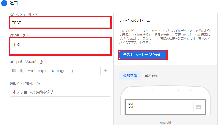 「タイトル」と「通知内容」を入力して「テストメッセージを送信」ボタンをクリック