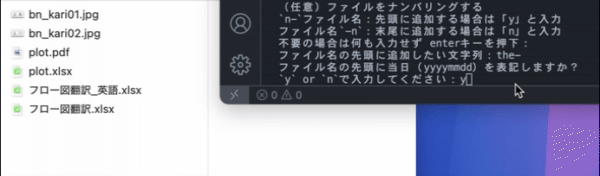 また、「1.ファイル名の全置換」処理では同じ拡張子ファイルが重複している場合は同じ拡張子のファイルがあります。重複ファイルは作成不可という通知文がターミナルに表示されて、そこで処理ストップするようになっています。