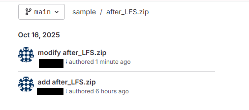 → ZIPファイルの実体はLFSサーバ側にアップロードされ、Gitにはポインタだけが保存される。