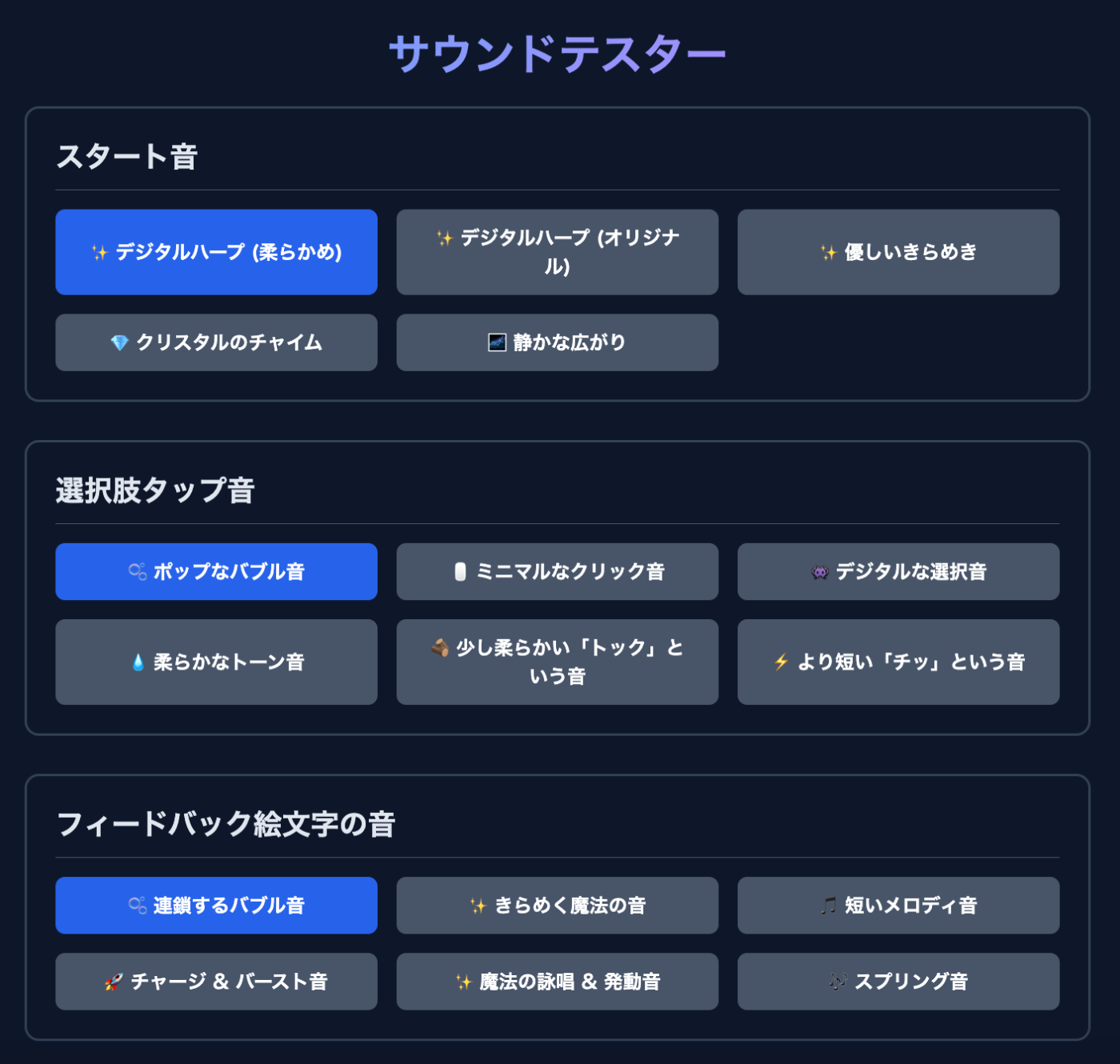 AIの提案により「Tone.js」というJavaScriptライブラリ[3]を活用して効果音を実装しました。