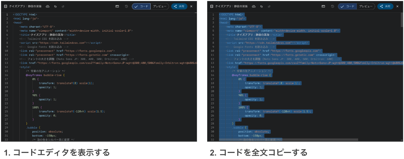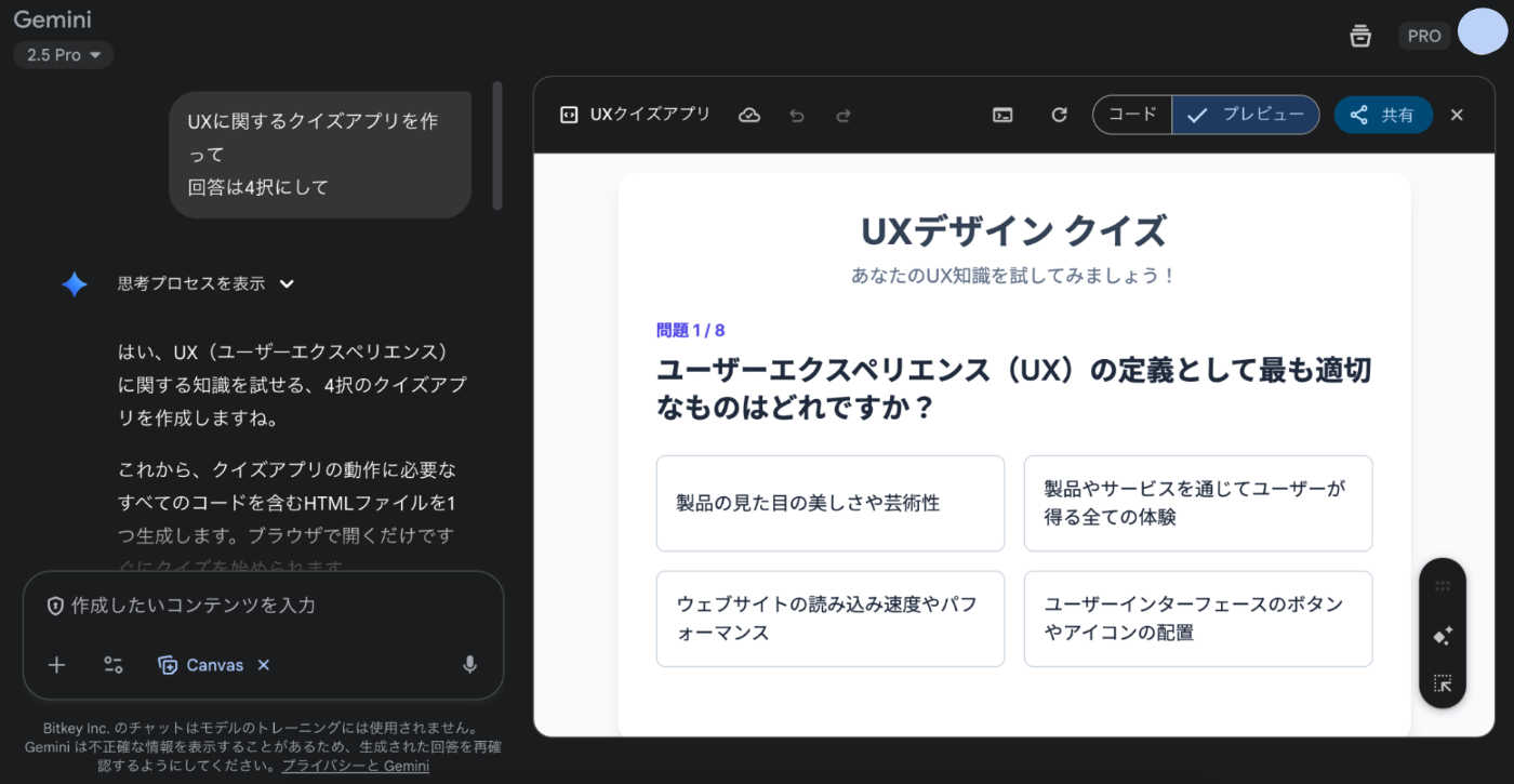 その結果、プロンプトを反映したクイズアプリが即座に生成されました。