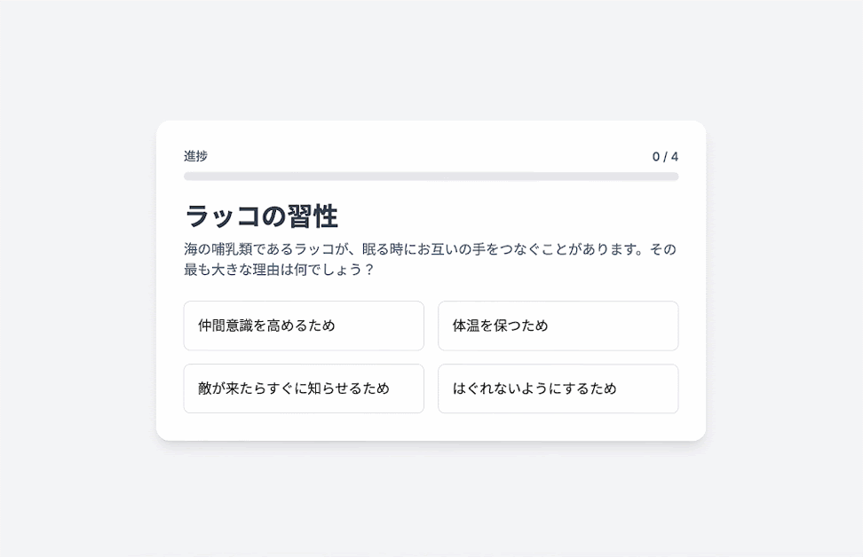 - 問題:海の哺乳類であるラッコが、眠る時にお互いの手をつなぐことがあります。その最も大きな理由は何でしょう?