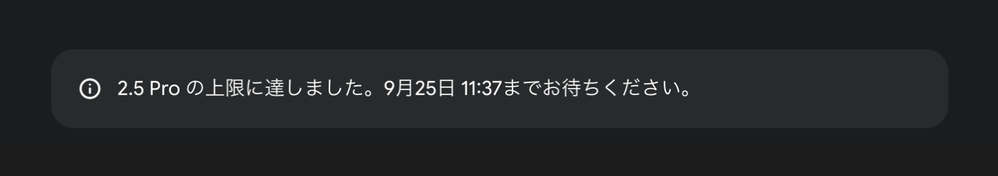 Geminiには利用上限があり、1日の上限を超えると翌日まで利用ができなくなります。