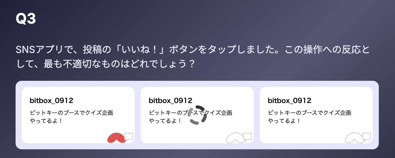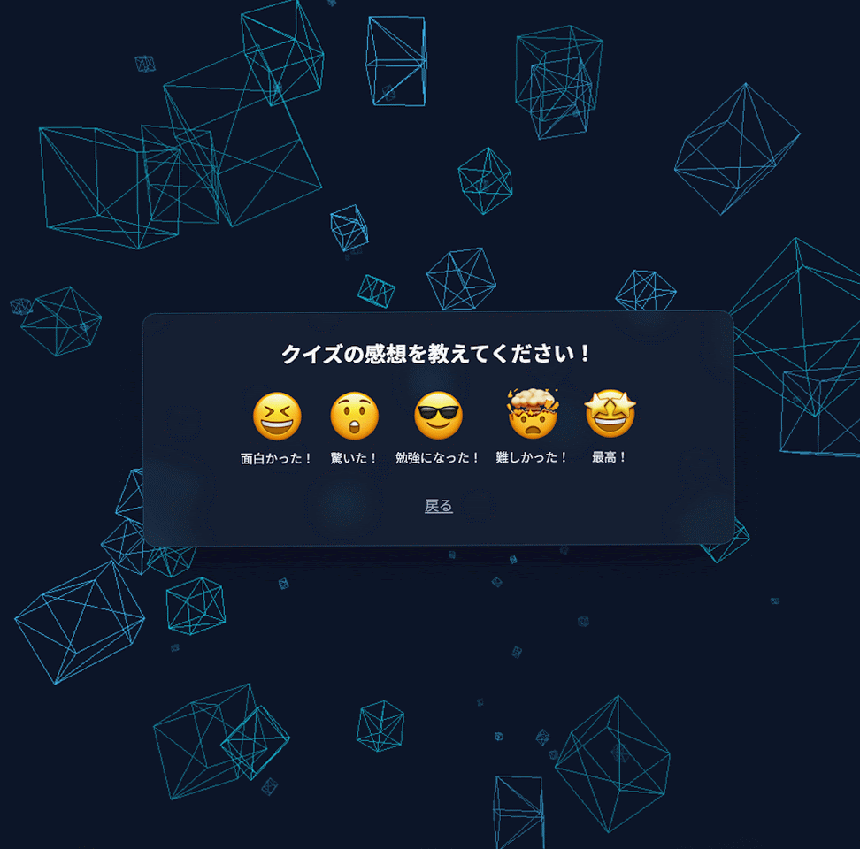 クイズの感想をアンケートする機能です。絵文字をタップすると結果が集計されます。