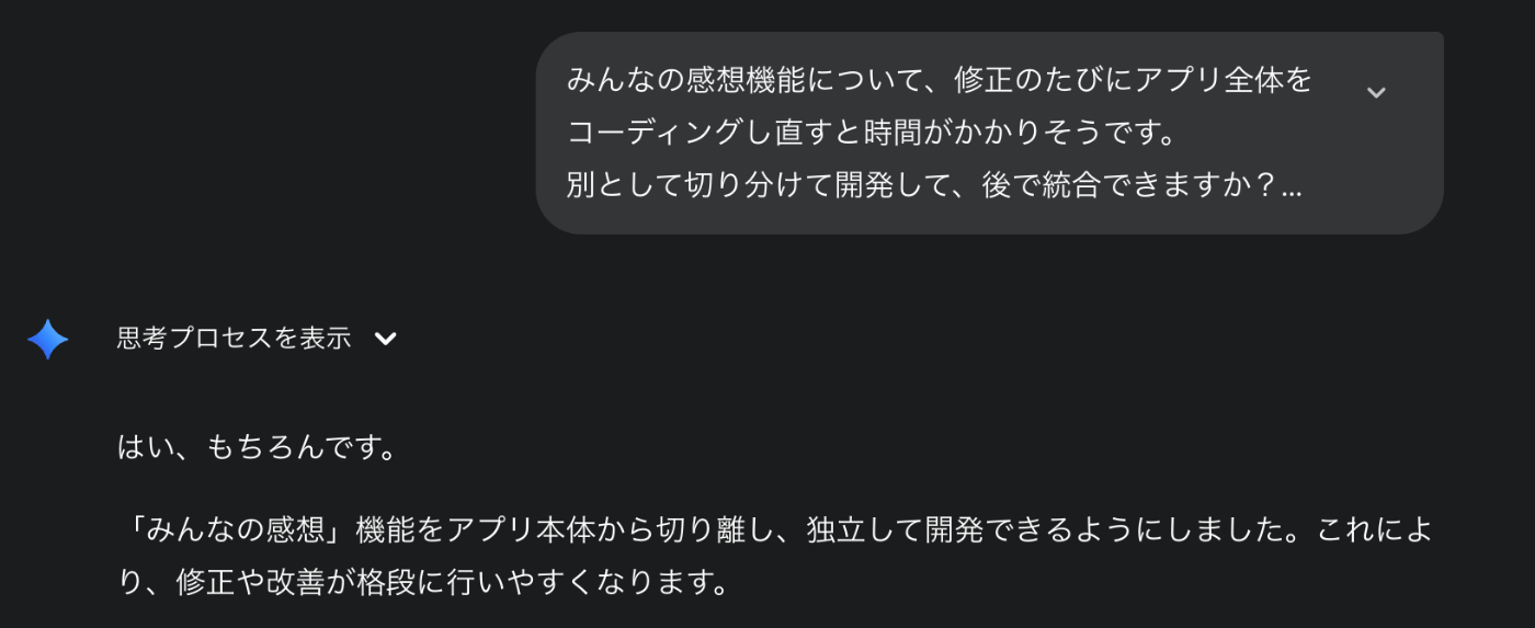 そのためこの方法は、対話形式でアプリの土台を固めた後、仕様を他者と共有しながら実装したい場合に適していると思いました。
