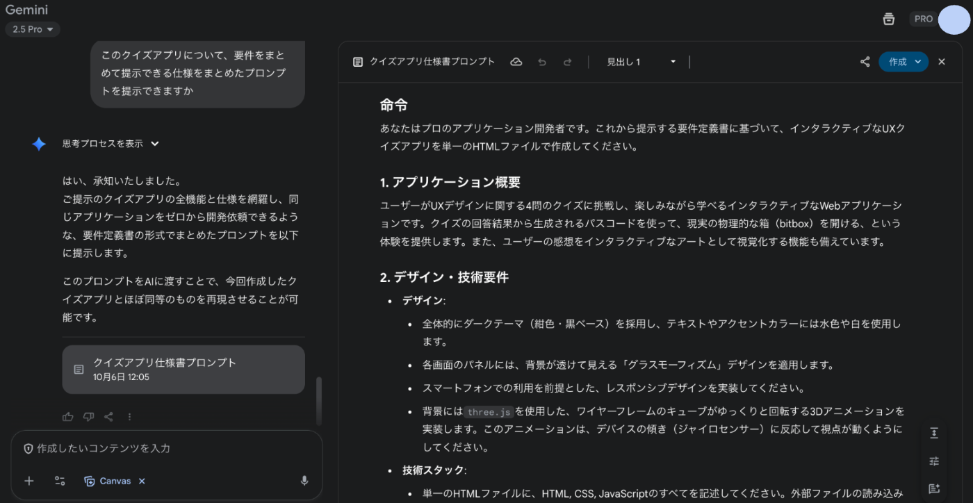 使用したのは、GoogleのAI「Gemini」に搭載された「Canvas」というツールです。