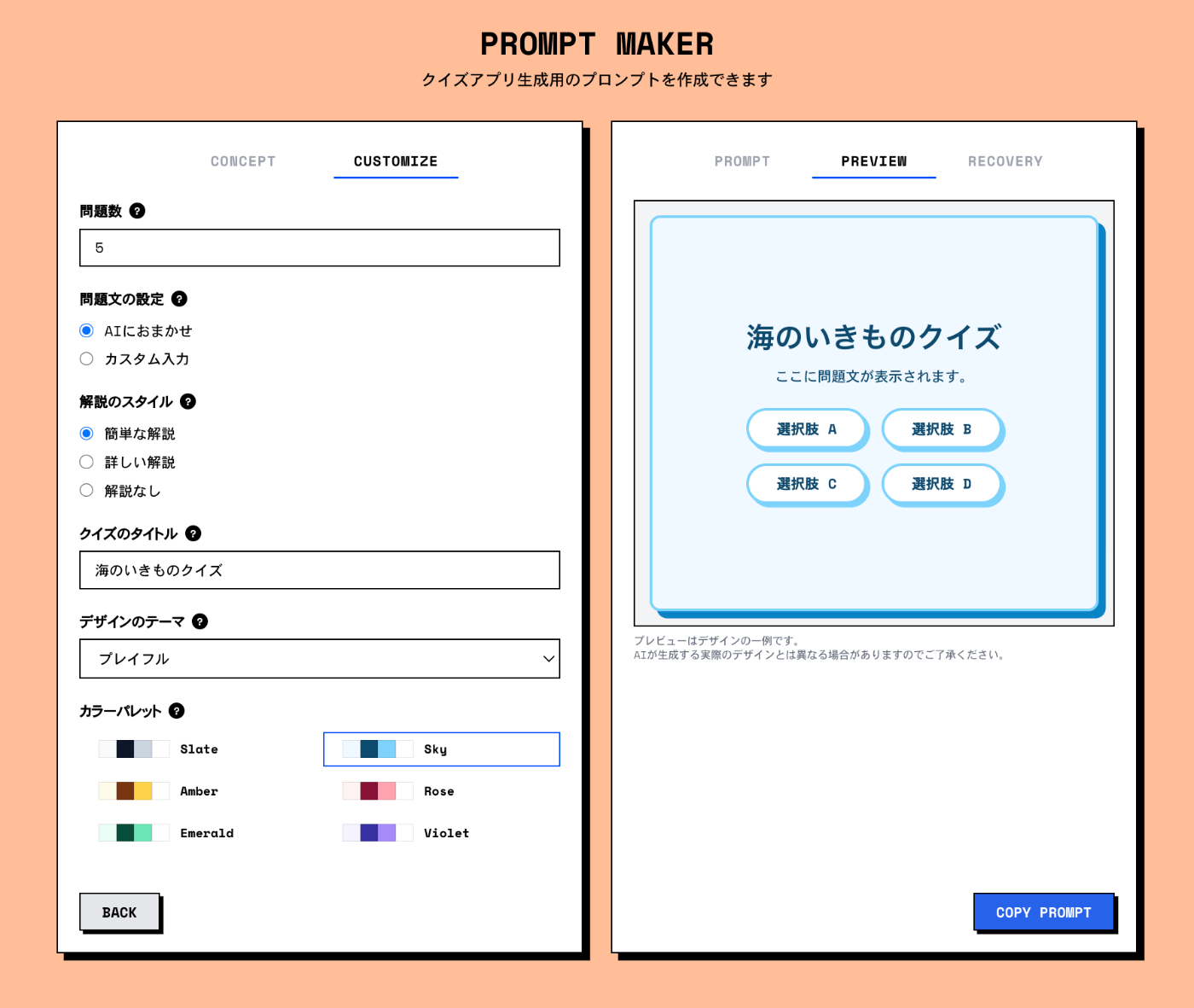 画面の案内に沿って設定を入力するだけで、指定したクイズの条件がコピー可能なプロンプトに変換されます。