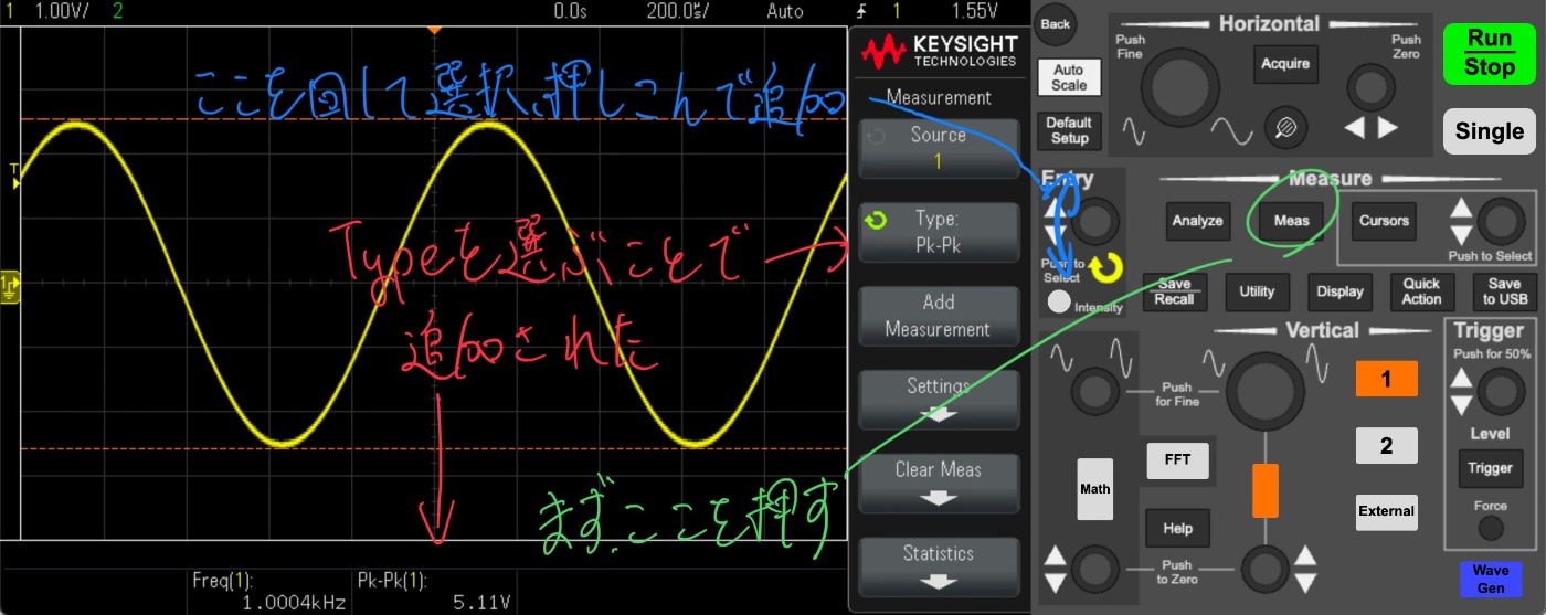 Measボタンを押すことでサイドバーにMeasurementモードが開きます。そこからSourceを選択し、Typeを選択します。セレクトノブを押し込むか、Add Measurementを押すことで、下部に固定表示することができます。測定データは最大5個まで追加できます。