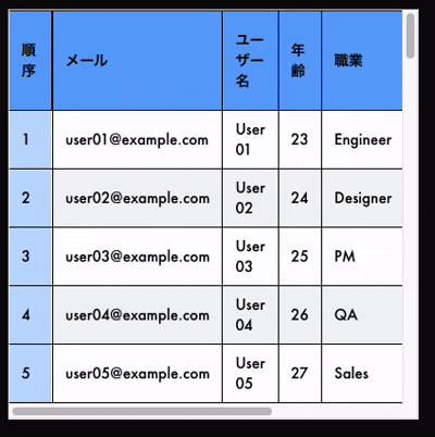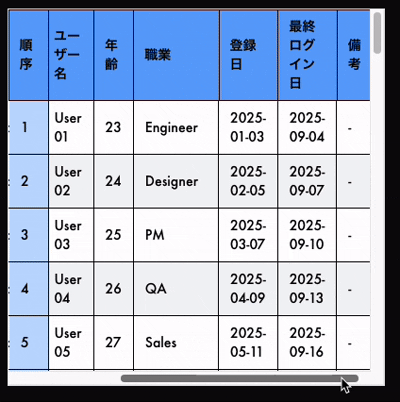<th className="sticky top-0 left-0 z-20 bg-blue-400 border border-black px-3 py-2">ユーザー名</th>