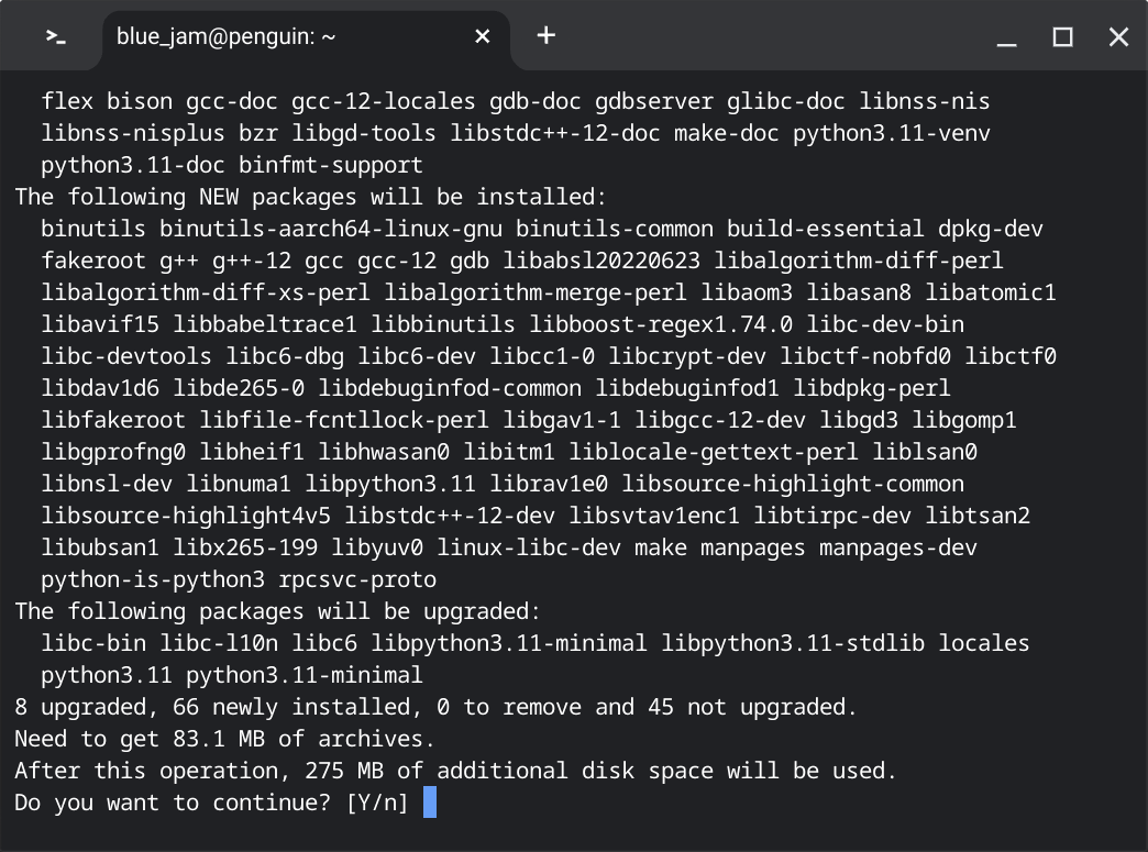- 無事に終わったら、次のコマンドを実行し、必要なソフトウェア(C++コンパイラなど)をインストールします。コンパイラは人が読めるソースプログラムを、コンピューターが実行できるファイルに変換するプログラムです。