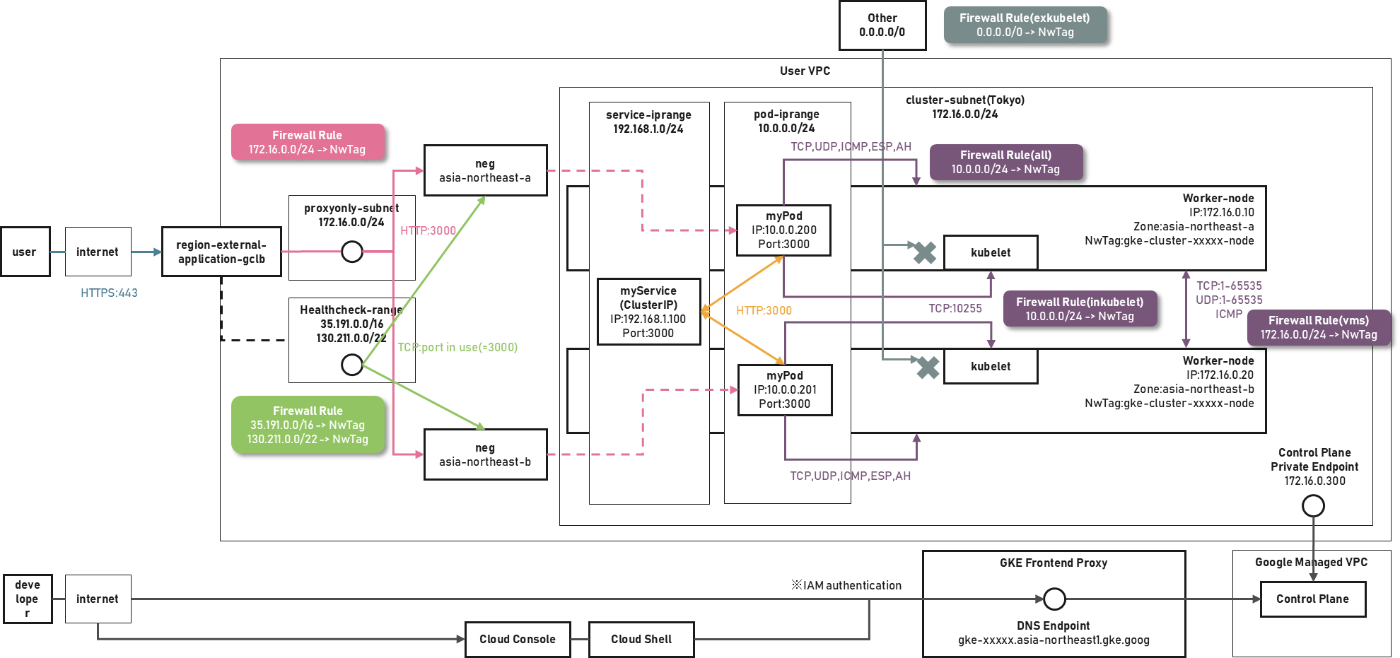 - 業務通信では、プロキシ専用サブネットからのHTTP系通信とヘルスチェック通信をFirewall Ruleで許可する必要があります。Network Firewallはワーカーノードをターゲットとしたルールになります。Google CloudではネットワークTagを使って制御するのが一般的です。