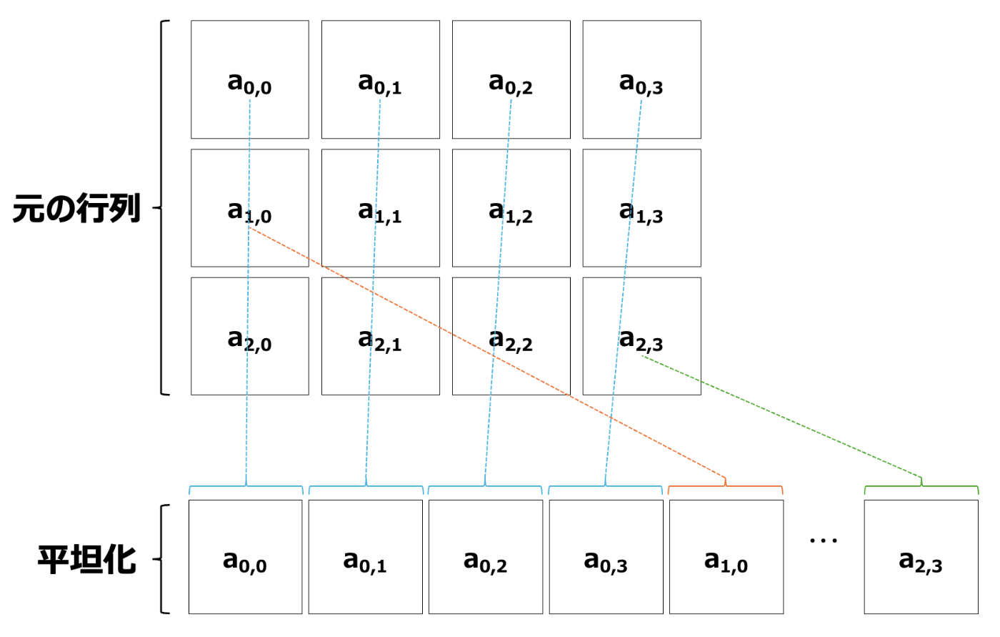 前記事で解説したとおり、多次元のデータは1次元のメモリに平坦化(flatten)して配置されます。前回のカラー画像は3次元のデータで少し複雑でしたが、行列は二次元データなのでシンプルです。以下に