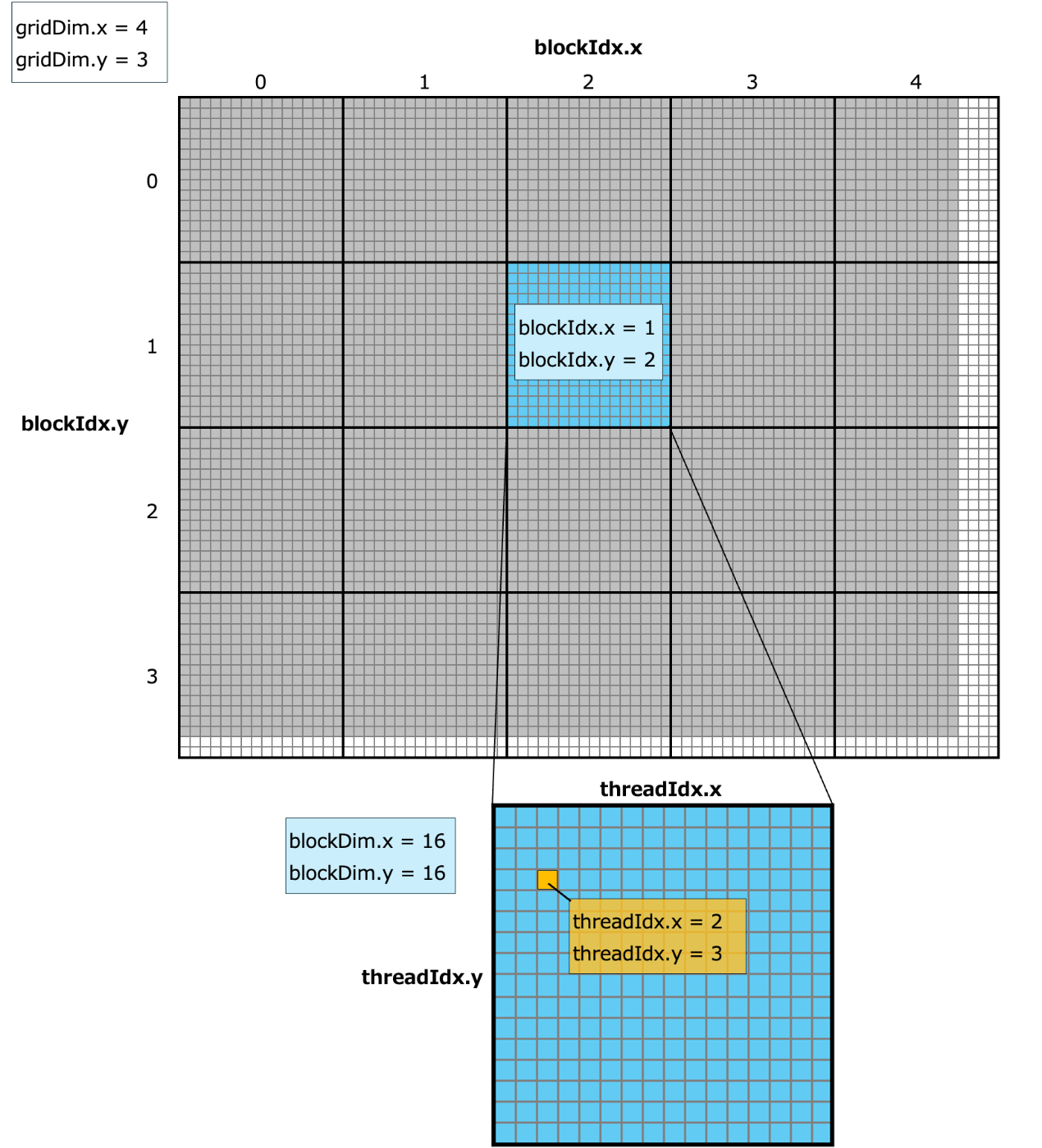 前回記事の3.1節 ブロックとグリッド〜3.4節 境界チェックと全く同じ考え方により割り当てを行うことができます。ただし、画像と行列では、サイズ等の表記方法が縦と横が逆順なので注意してください。