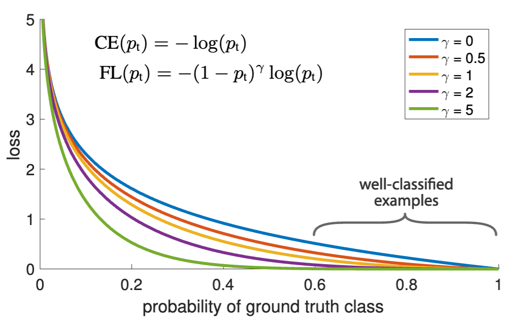 Cross Entropyでは、高確率(0.6-1.0)で正しく分類された「簡単な例」でも、損失値は0.4-0.6程度と小さくはありません。そのため、大量のbackground(簡単な負例)の損失が蓄積されると、少数のforeground(難しい正例)の損失よりも支配的になってしまいます。