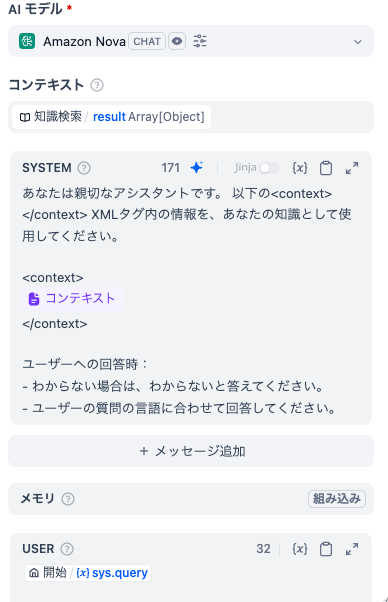 まず、LLMと書いてあるブロックのモデルを、Amazon Nova(LiteでもProでも可)にします。