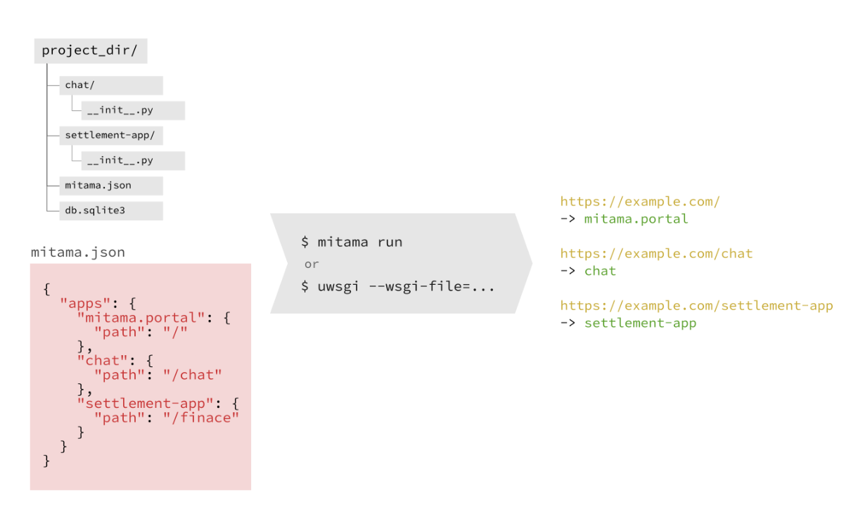 mitama.jsonは起動したいPythonパッケージの名前と配信先のパスを対応付けて記述します。