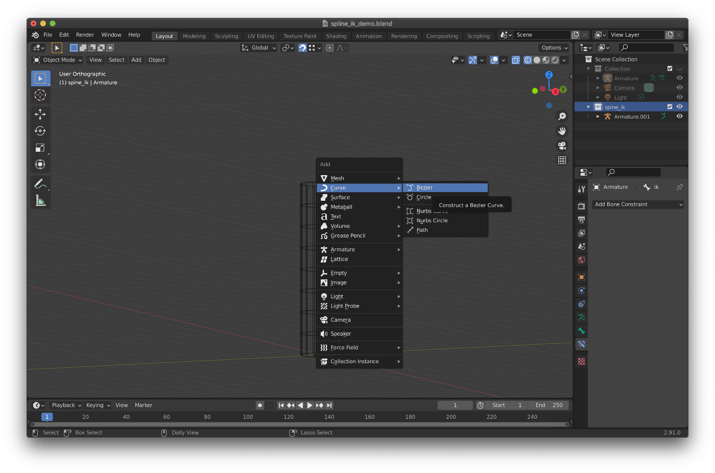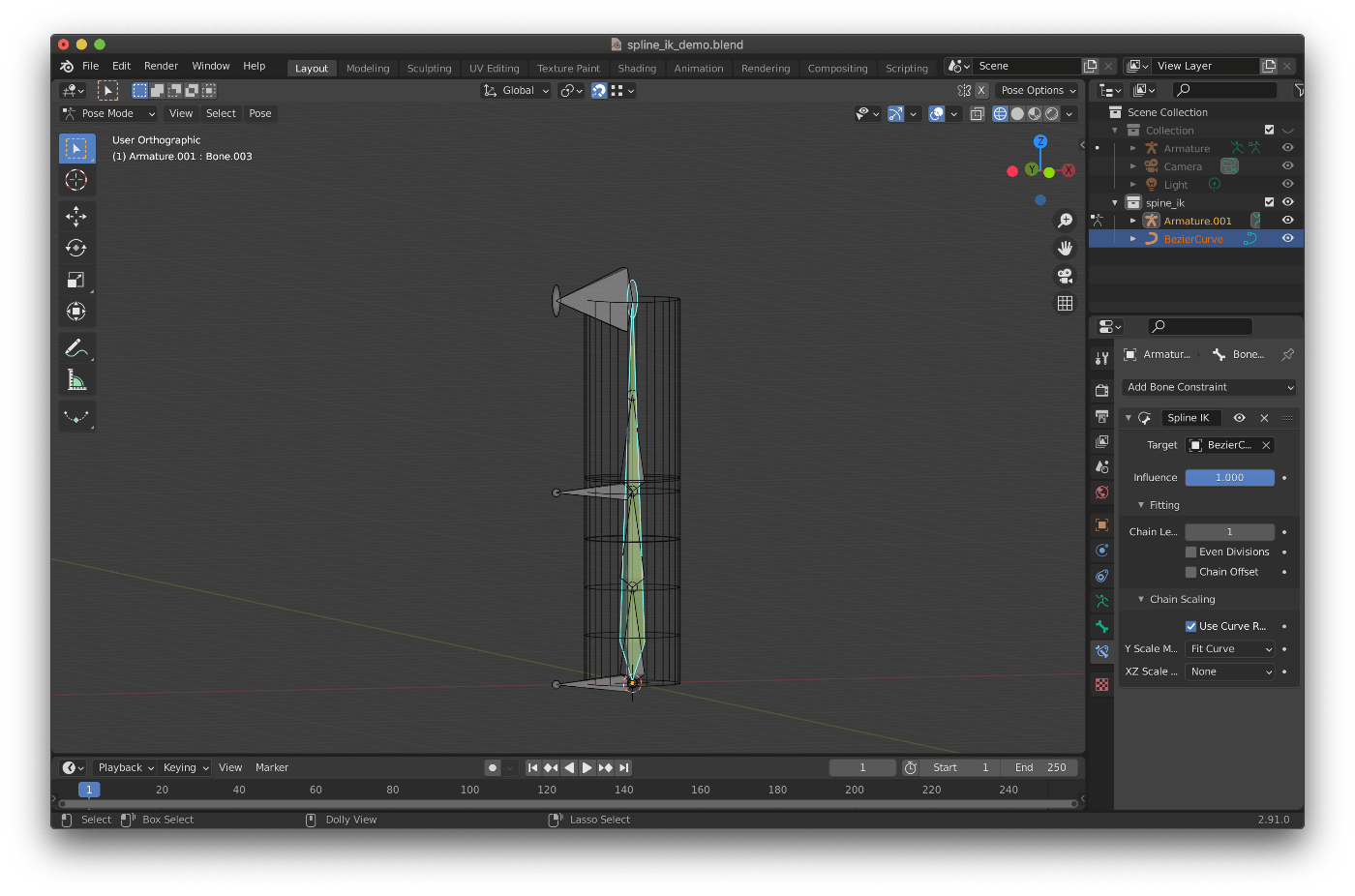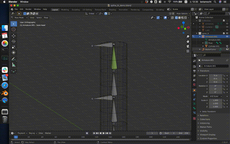 しっぽを滑らかに動かすために Blender(v3.1.0) で Spline IK という機能を使ってみました.その時の設定方法のメモです.