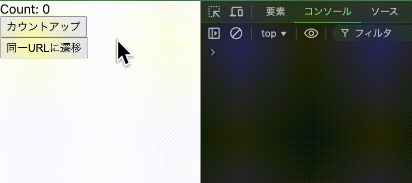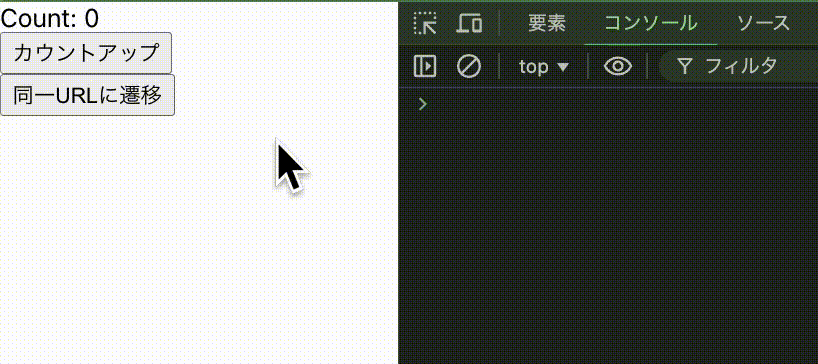 About 画面で count を更新した後に同一 URL に遷移した際、count の初期化とコンソールへの"use effect!"の表示を期待しましたが、実際には About コンポーネントは再マウントされないためこれらは起こりません。