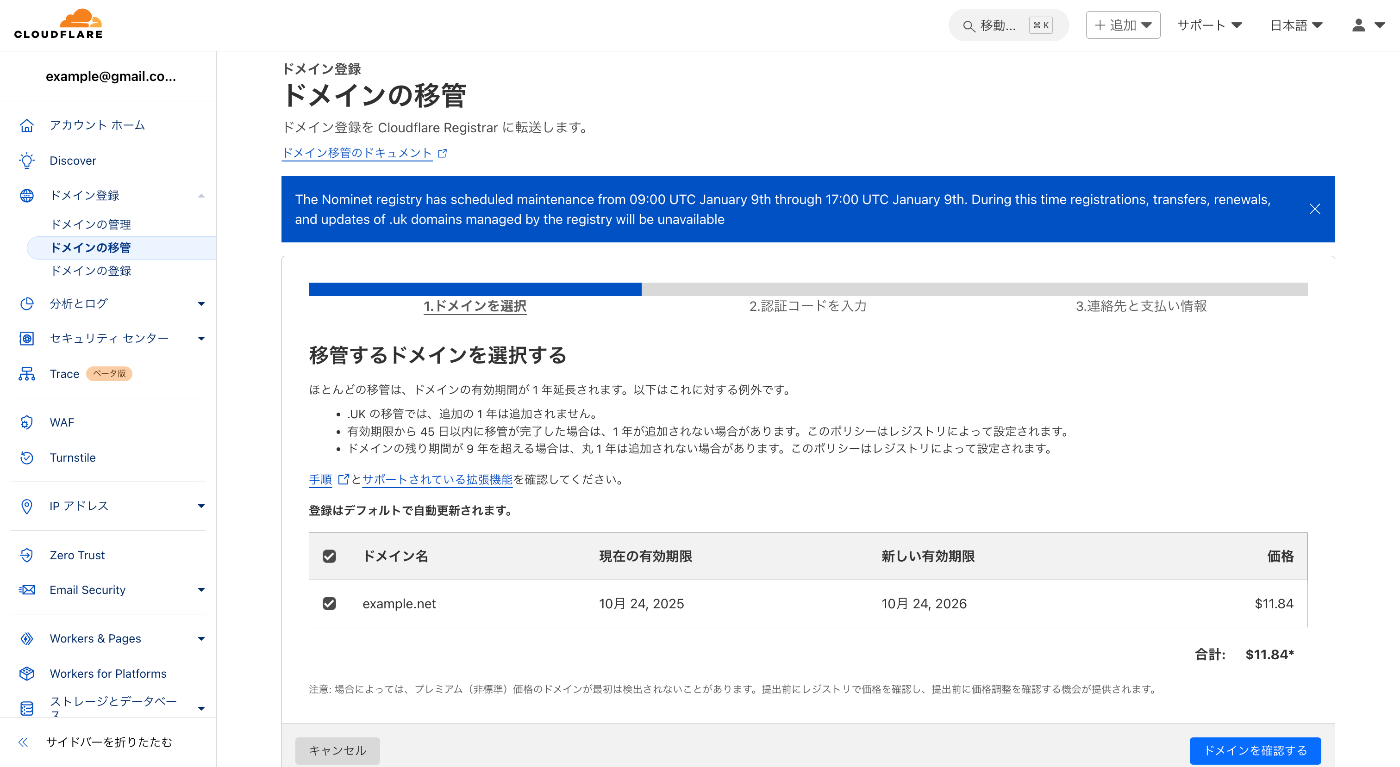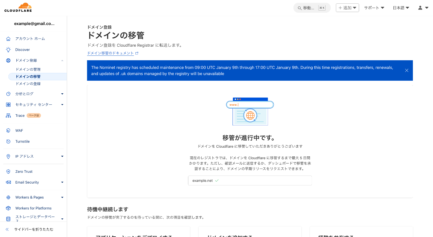 手続きが終わるとこのような画面になります。また 「Your transfer to Cloudflare Registrar is underway」というメール が届きます。