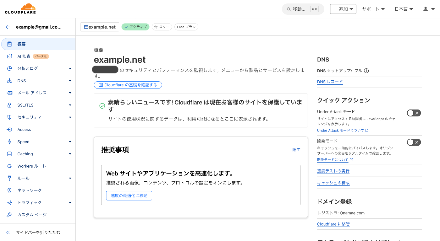 ネームサーバーの設定が完了すると、Cloudflareのドメイン詳細ページの表示が変わります。