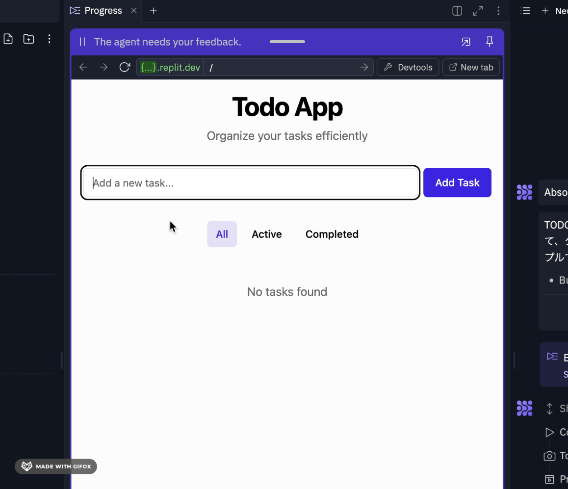 プレビューできる段階まで開発が完了すると、ReplitAgentはコード生成を中断し、ユーザーに対して、「できたものをデバッグで確認して欲しい」という要求を行います。