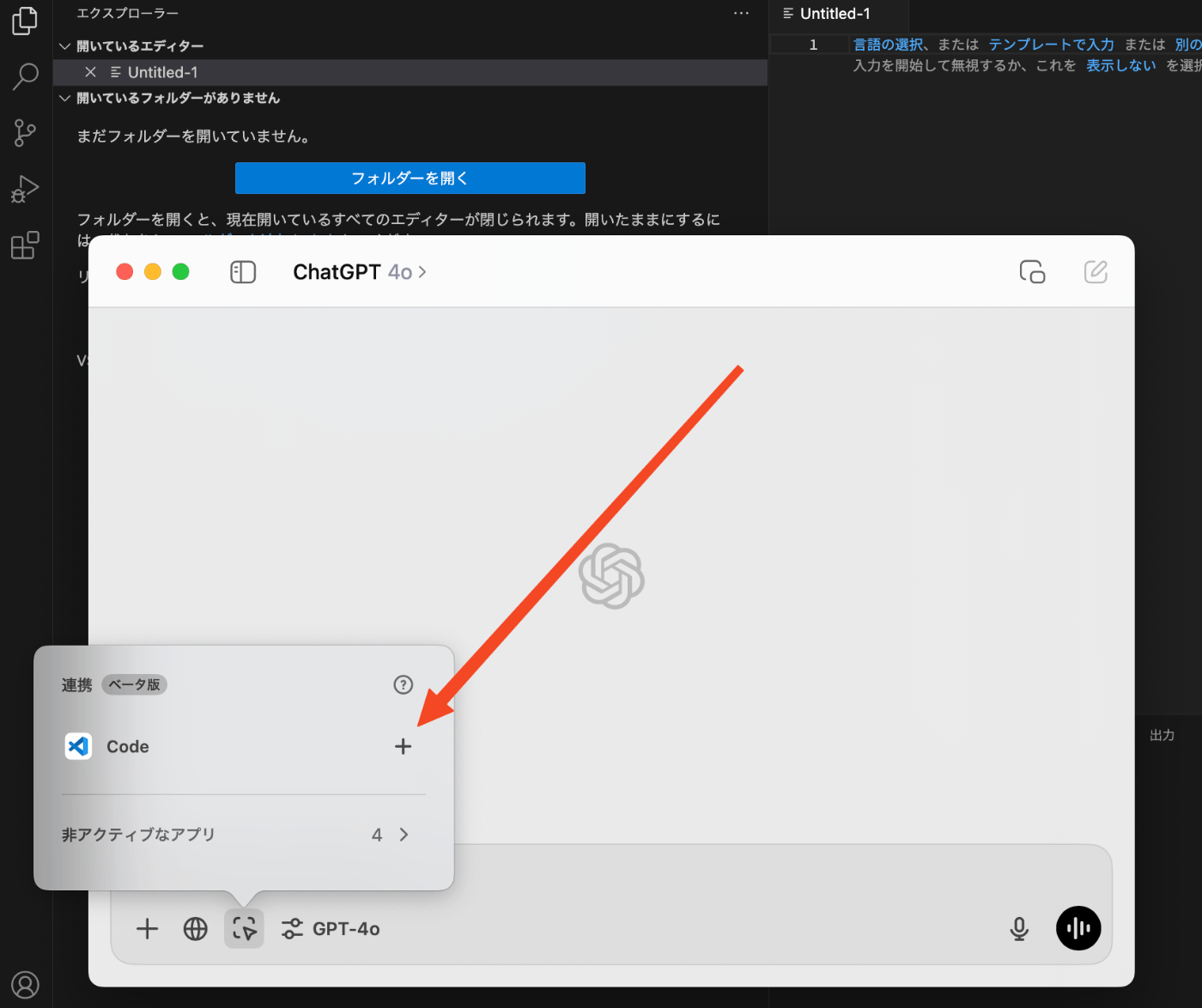 VSCodeを開いた状態でChatGPTアプリを開き、連携アイコンをクリックするとVSCodeが認識されるようになっています。