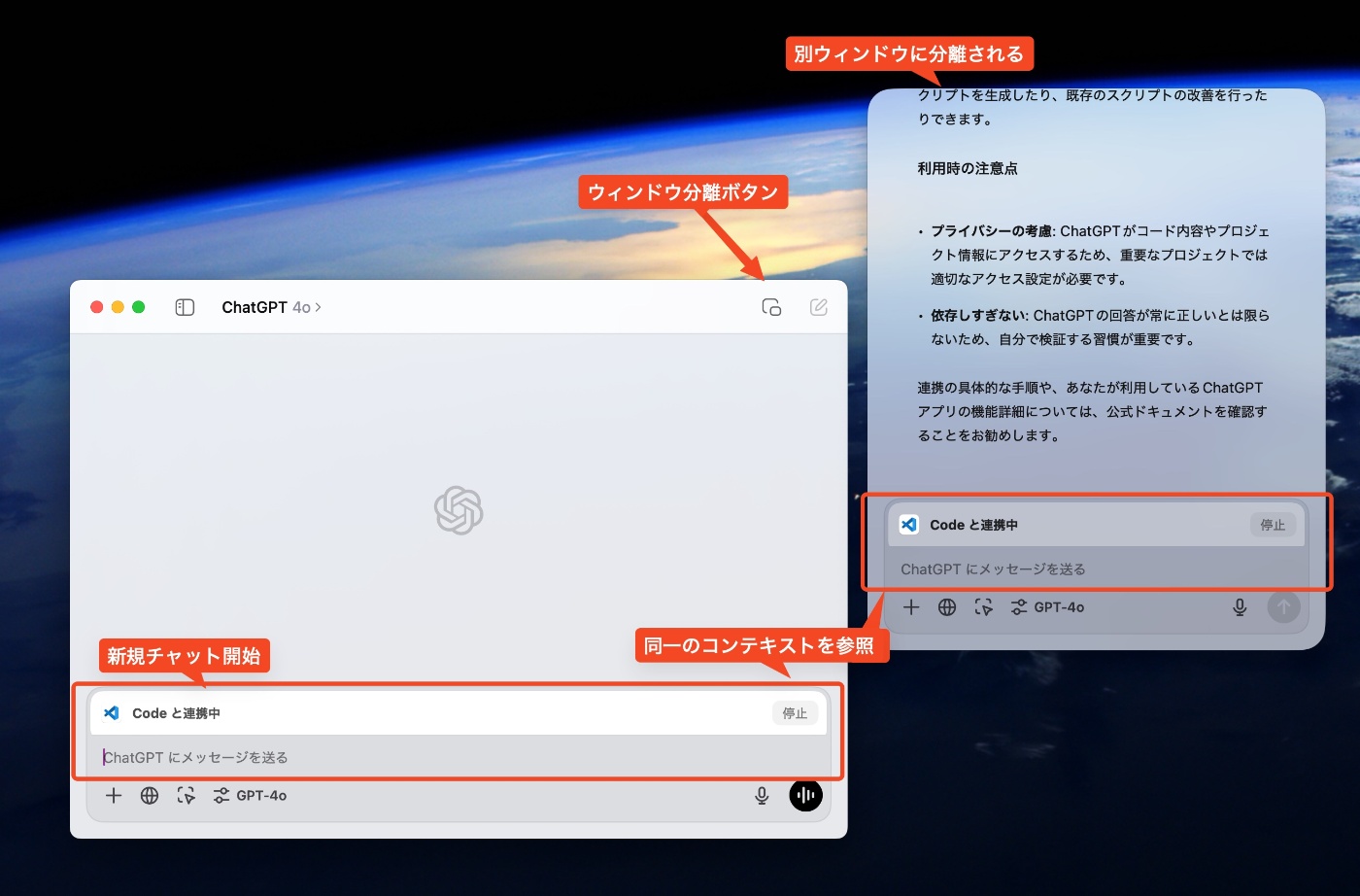 ChatGPTアプリの右上にあるアイコンをクリックすることで、コンテキストを保ったままチャット欄が新規ウィンドウとして開き、元のアプリ部分では新規チャットが開始されます。
