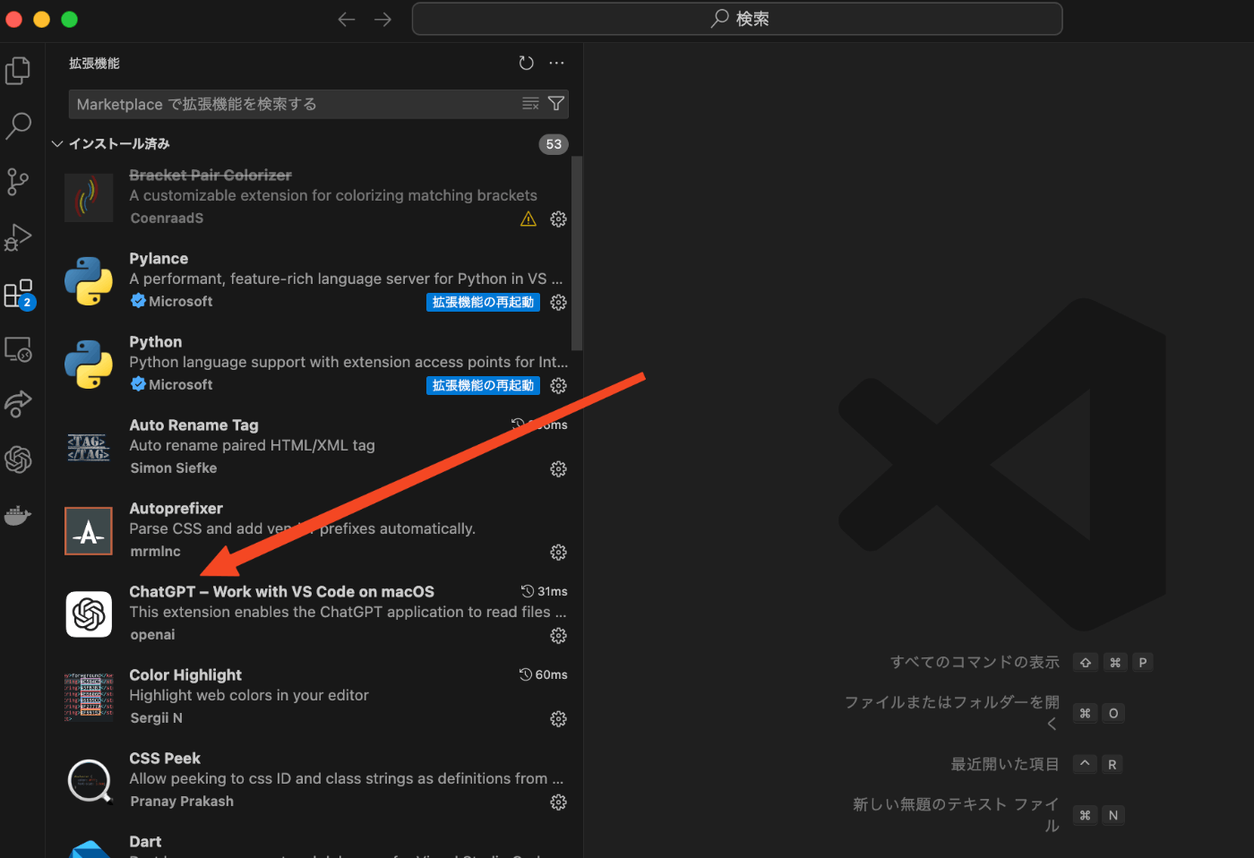 そして、VSCodeのインストール済み拡張機能一覧に「ChatGPT – Work with VS Code on macOS」が追加されているのを確認してください。