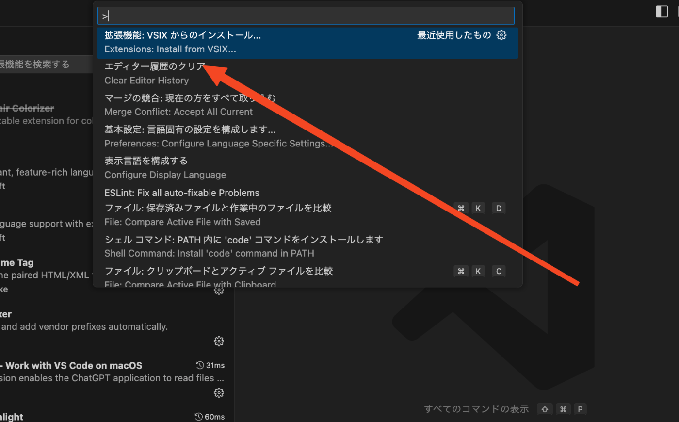 VSCodeを開いた状態でCMD+Shift+Pを押してコマンドパレットを開き、「拡張機能:VSIXからのインストール」を選択。