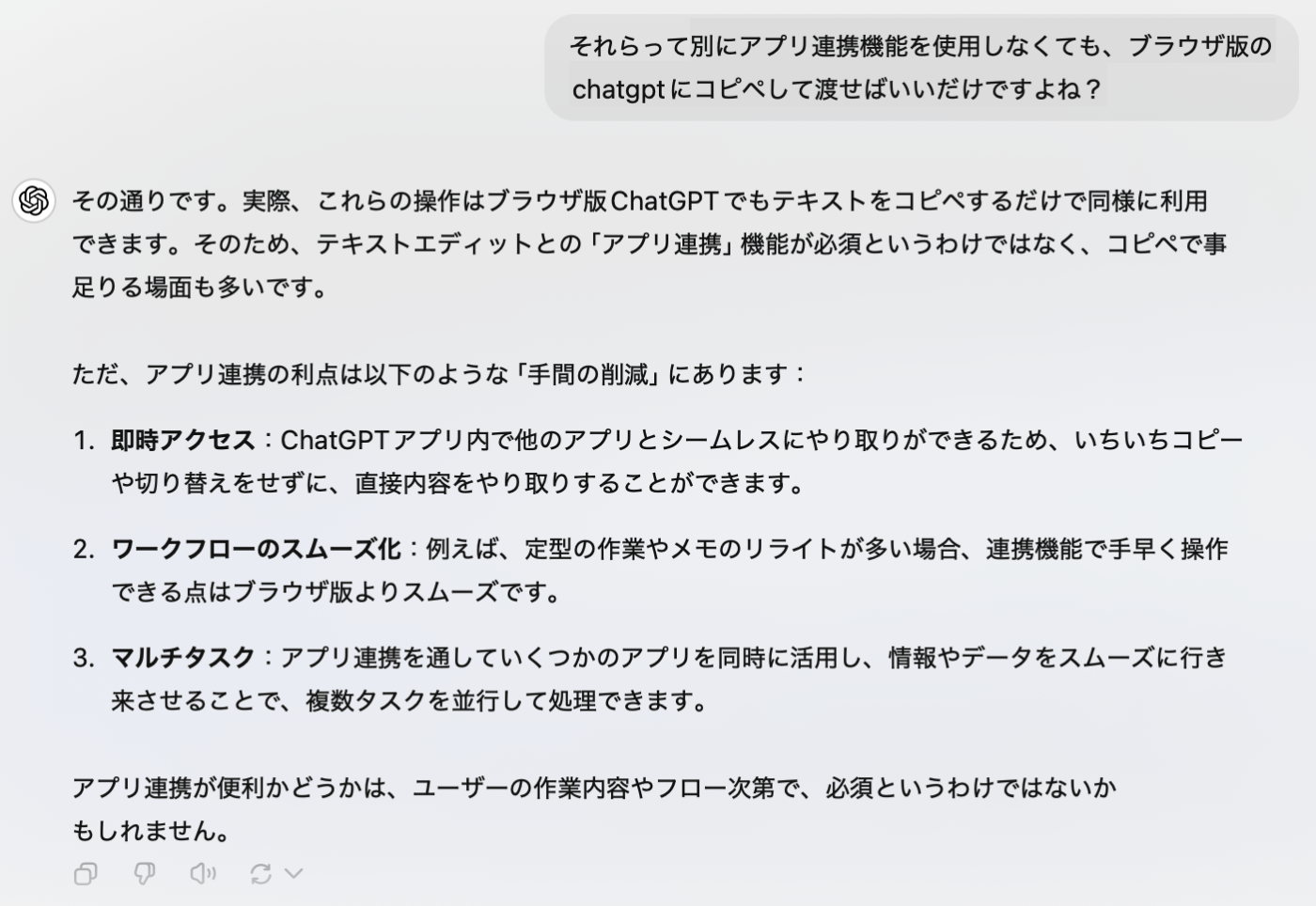 私なりにChatGPT for Macを使い倒した結果、連携機能の一番の利点はそこではないと私は思いました。