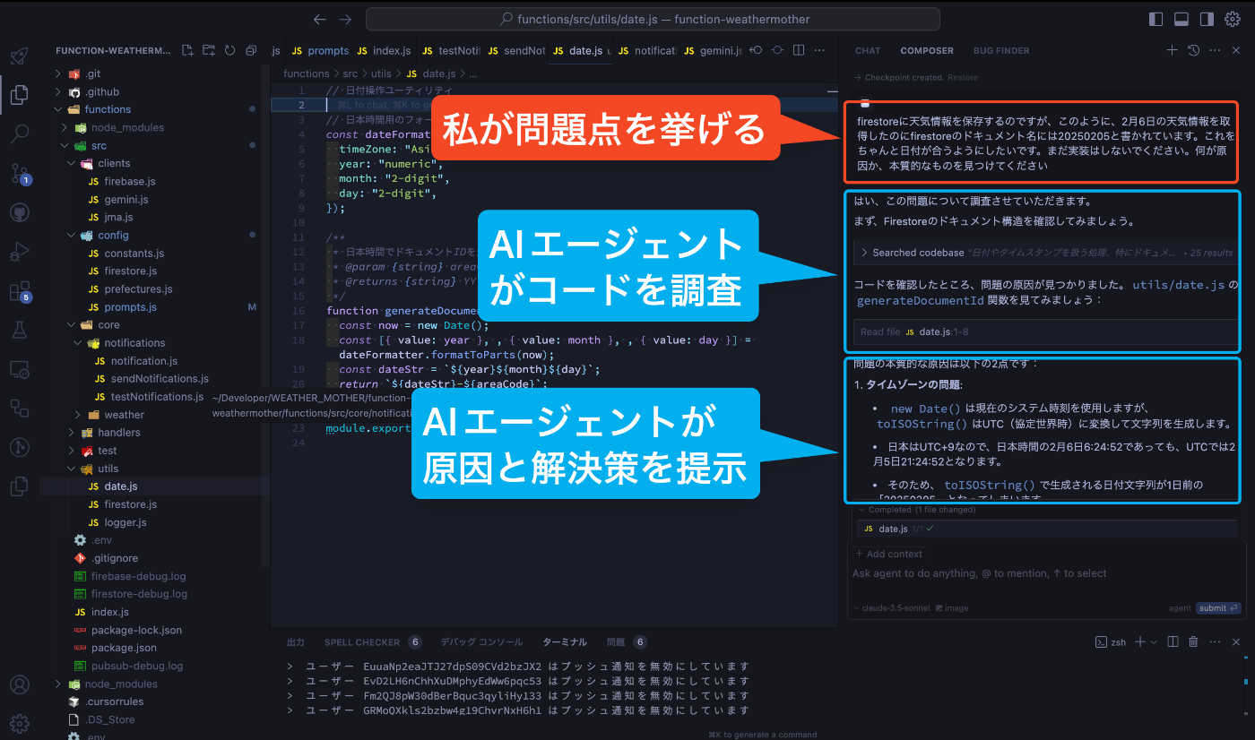 - ターミナル出力を確認し、エラー表示がある場合はそのままAIが修正を行う