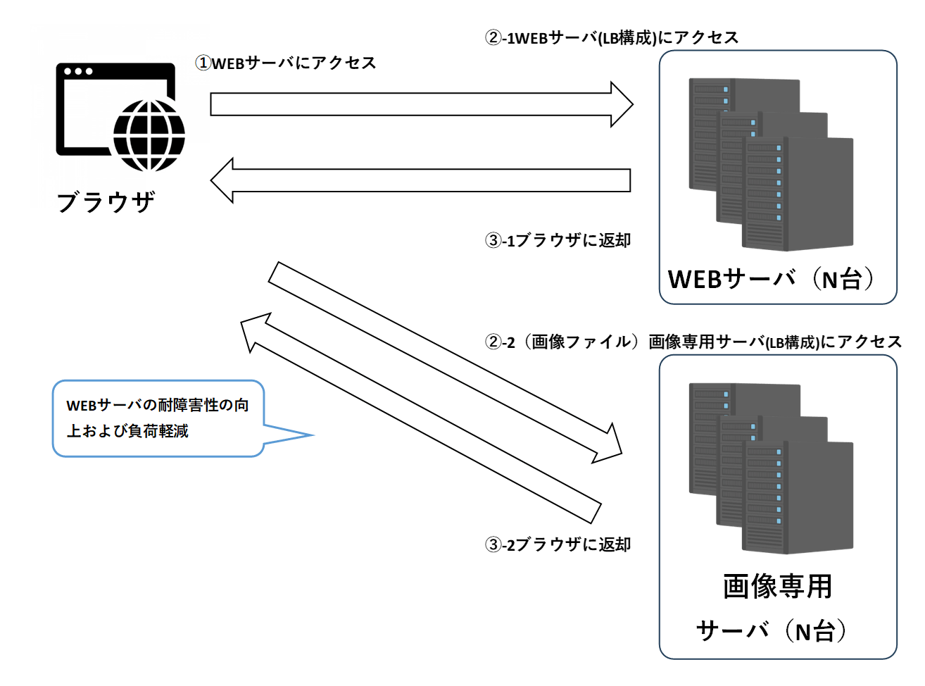 WEBサーバ複数台構成にしたロードバランサー(LB)を導入し、WEBページのアクセスの振り分けを行い負荷分散を実施