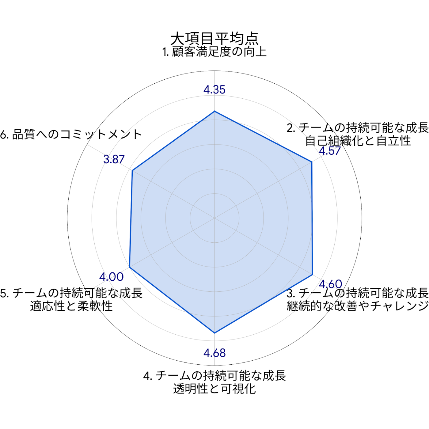 - 「スプリントの状況可視化」は5.25点、「役割を越えた協力体制」は5.08点と高得点を記録。「困ったら助け合う」文化が根付いていることが数字で証明され、これはチームの自信になりました。