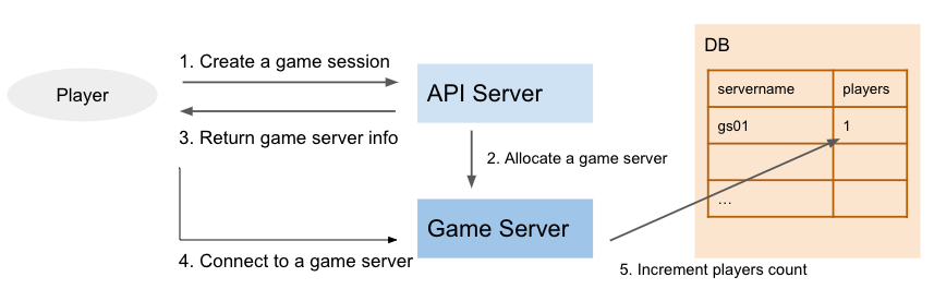 2人目のプレイヤーが同じゲームに参加する場合を考えると割り当てたGame Serverの情報をどこかに保存しておく必要があります。割り当てと同時にDBにGame Serverの情報を書き込むのが一般的でしょうか。そうすることでAPI Serverは2人目のゲームへの参加要求を受け取るとDBを見て最初に作られたGame Serverへと誘導できます[3]。