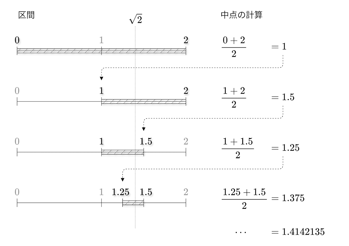 図 1 二分法で解(√2)を求める