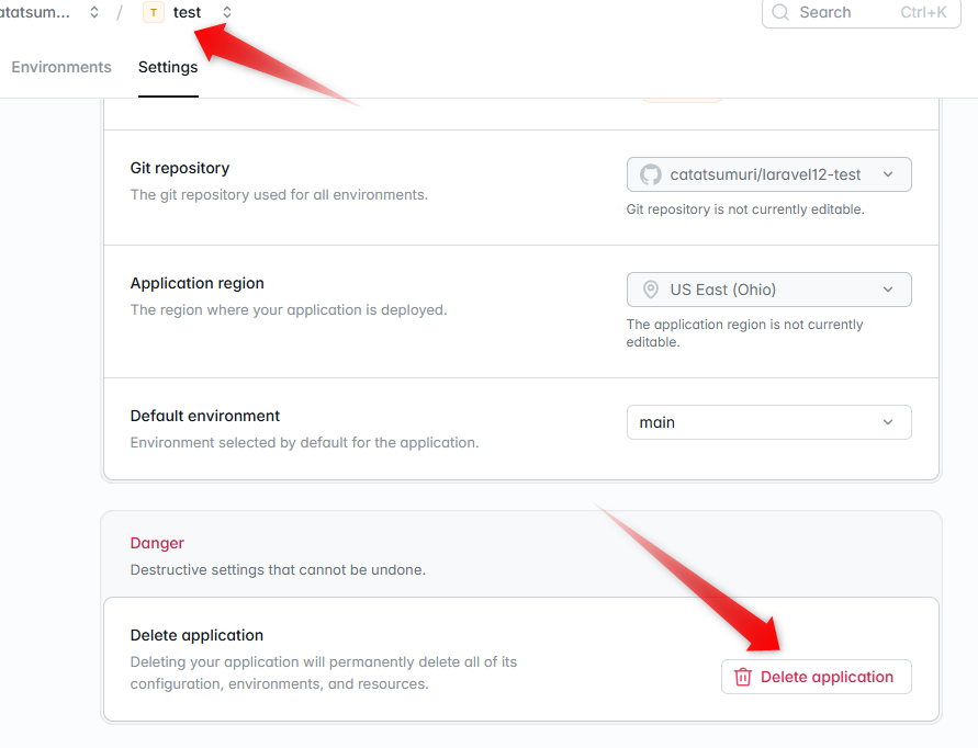 ちょっとわかり辛いのだけど、アプリケーションにつき、いくつか環境を簡単にセットできる。ここではmainとtestを置いてみた。