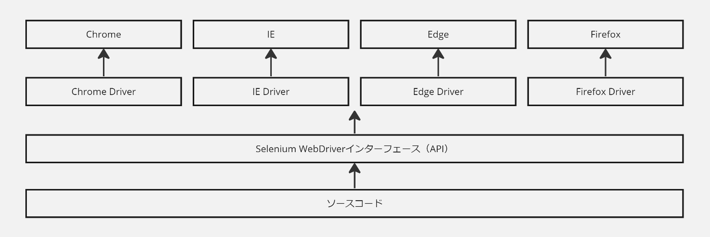 📖Selenium WebDriver の概念図2024/05/02に公開Seleniumtech ソースコードの役割 WebDriverインターフェース(API)へのアクセス ブラウザへの操作内容の定義 Discussion