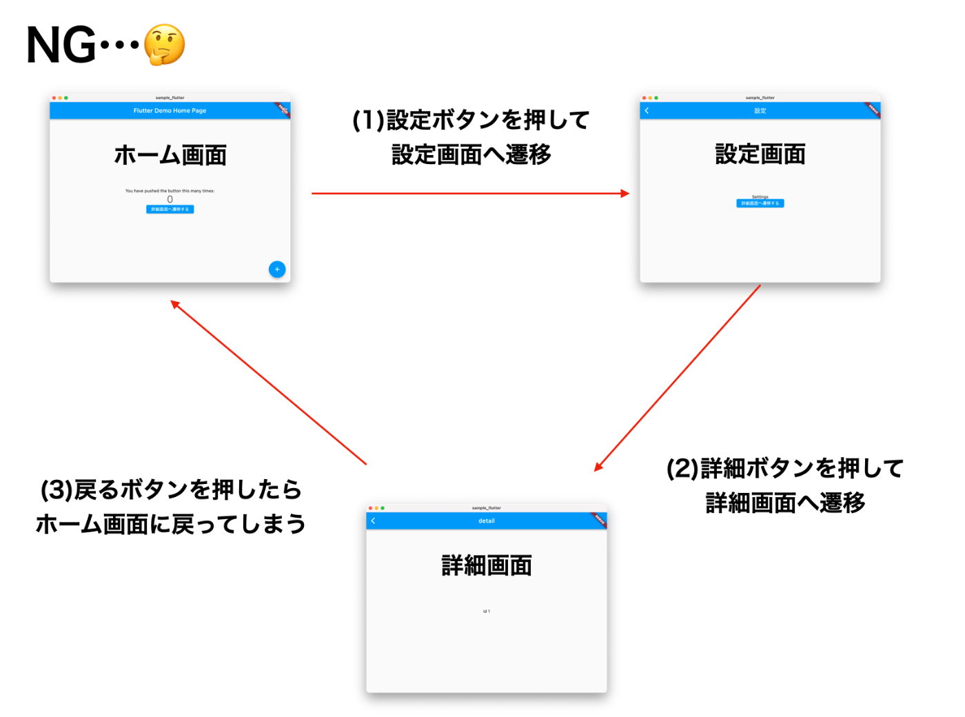 ホーム画面から設定画面、設定画面から詳細画面への遷移はできた。ただ詳細画面で戻るボタンを押すとホーム画面に戻ってしまう問題が発生した。