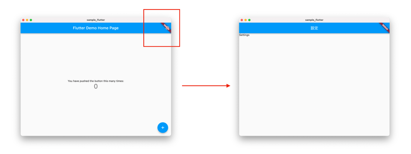 ホーム画面と設定画面を作った。ホーム画面のAppBar上にある設定ボタンをタップしたら設定画面へ遷移したい。