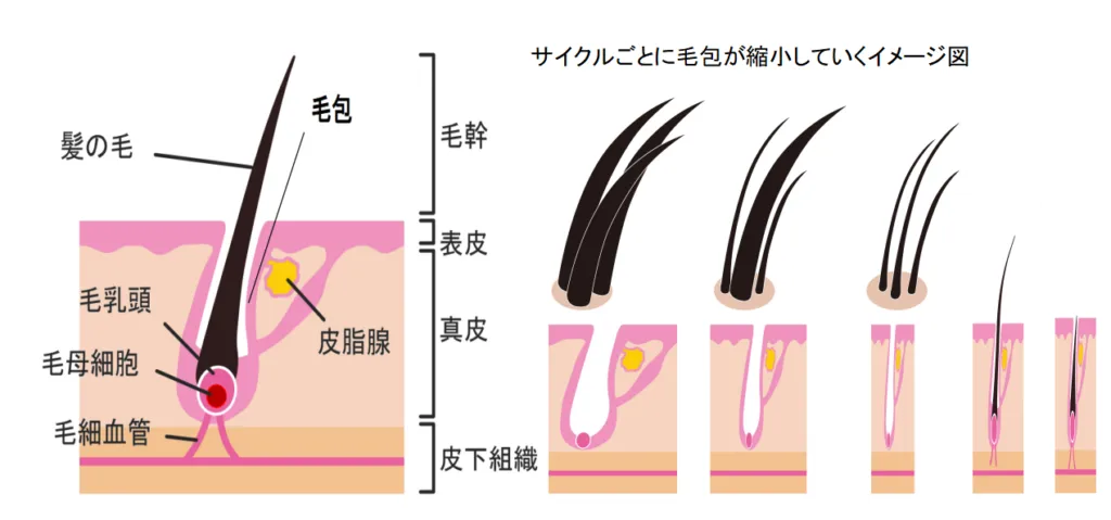 一言で言うとこれです、乱暴に言うとホルモンの働きで、毛根の寿命的なやつが縮められて、脱毛が起きてるらしいです。(毛根には寿命がある)