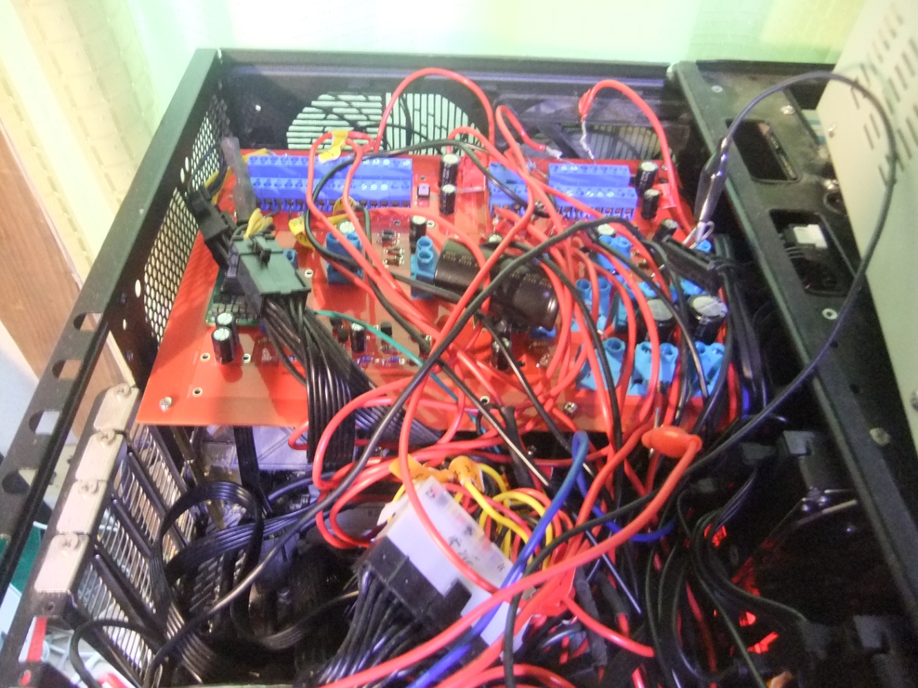 太陽電池から配線を通じて、Chariot SACSの基板に接続します。 Chariot SACSの基板は、太陽電池からの電力を12V、5Vに変換し、PC電源が電力系統の交流100Vから変換した12V、5Vと混ぜ合わせます。 ここで、太陽電池が発電しない夜間等は、電力系統からの電力のみ使い、太陽電池が発電すると、発電量に応じて、太陽電池からの電力を優先的に使い、その分電力系統からの電力使用を減らします。この制御は、Chariot SACSの基板が、フィードバック制御により、自動的にやります。 そのため、太陽光が発電したりしなくなったりしても、人間が配線を切り替えたりする必要はありません。 また、万一太陽光パネルからChariot SACSの基板までの配線が切れたりしても、すばやく電力系統からの電力のみを使用するように切り替えるので、PCが遮断したりはしません。