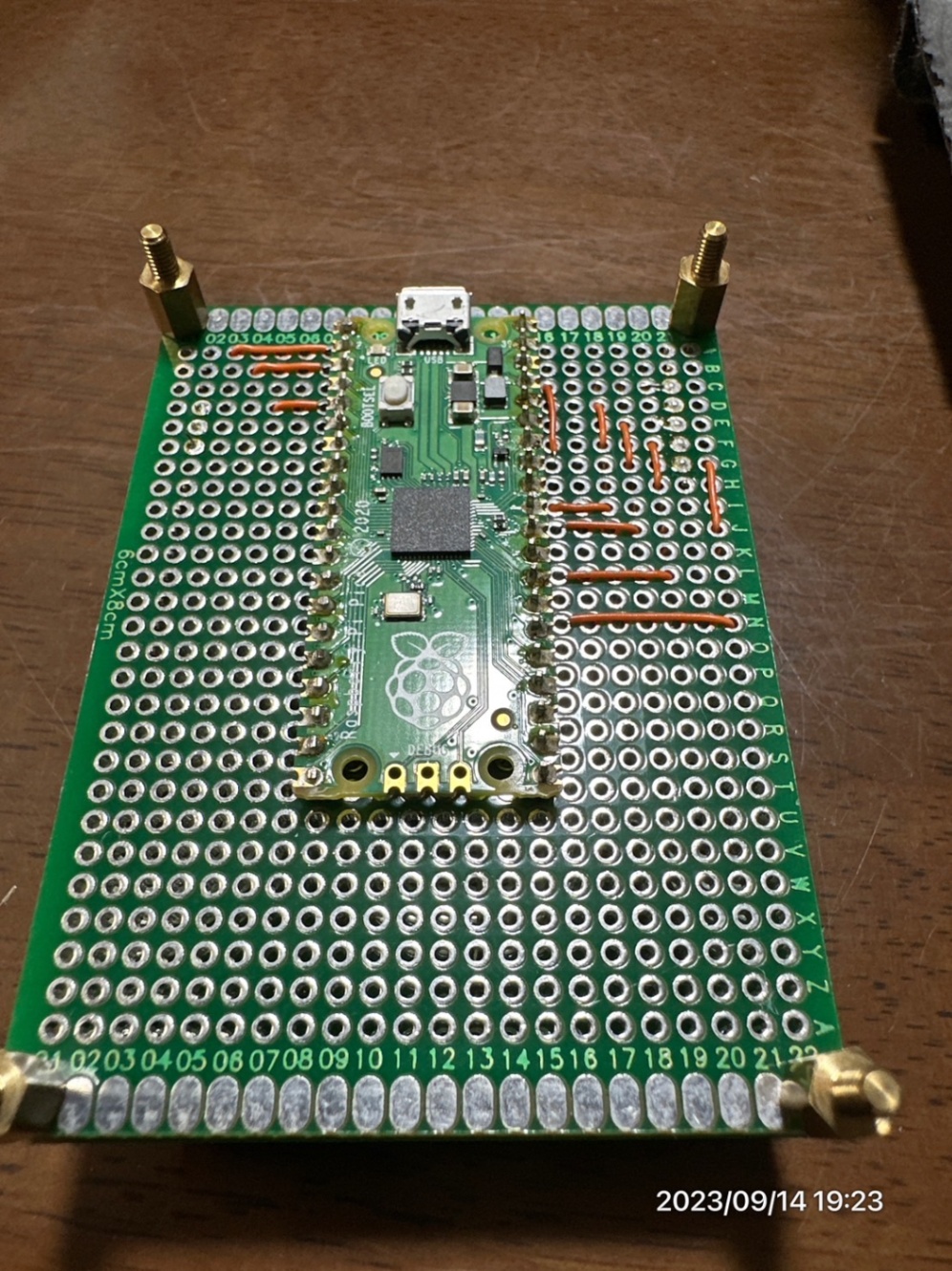 裏側から見たのがこれです。基盤の一階部分と二階部分のスペースが少ないのでラズパイピコを裏側に実装しています。