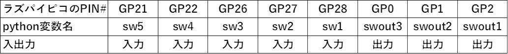 プログラムの説明の前にプログラムで使う変数と実際の回路とスイッチとの対応表を示します。この後のプログラムの説明はこの表を参照しながら読むと理解できるかと思います。