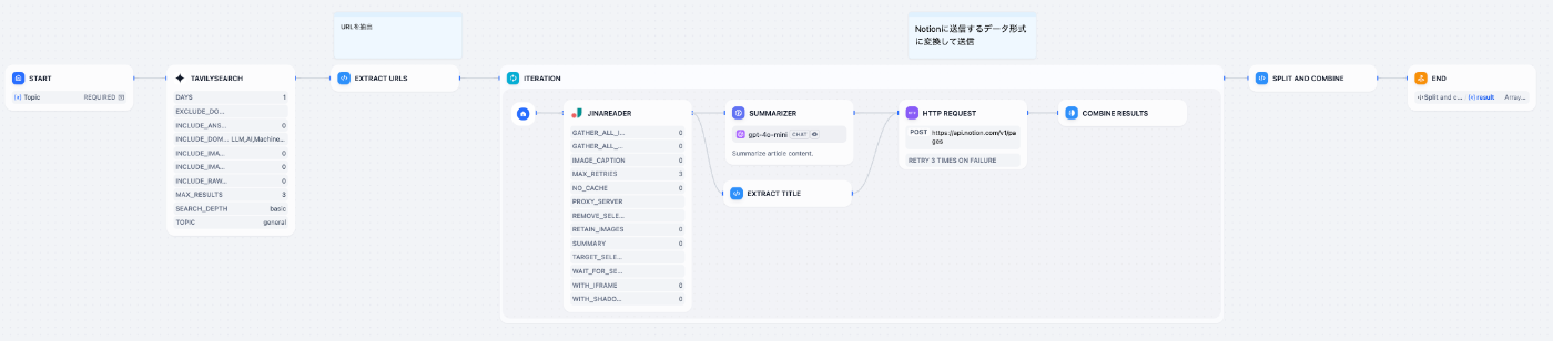 そこで、いい感じに情報を収集して要約してNotion DBに格納してくれるものがあった良いな〜と思い、サクッとDifyでできないかなとワークフローを構築して検証してみたので、その内容を共有したいと思います。
