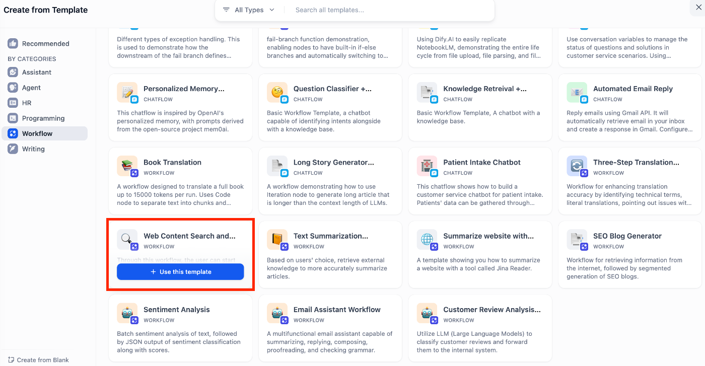 ちなみに、今回のワークフローはテンプレートの「Web Content Search and Summarization Workflow」をベースにして作成しています。