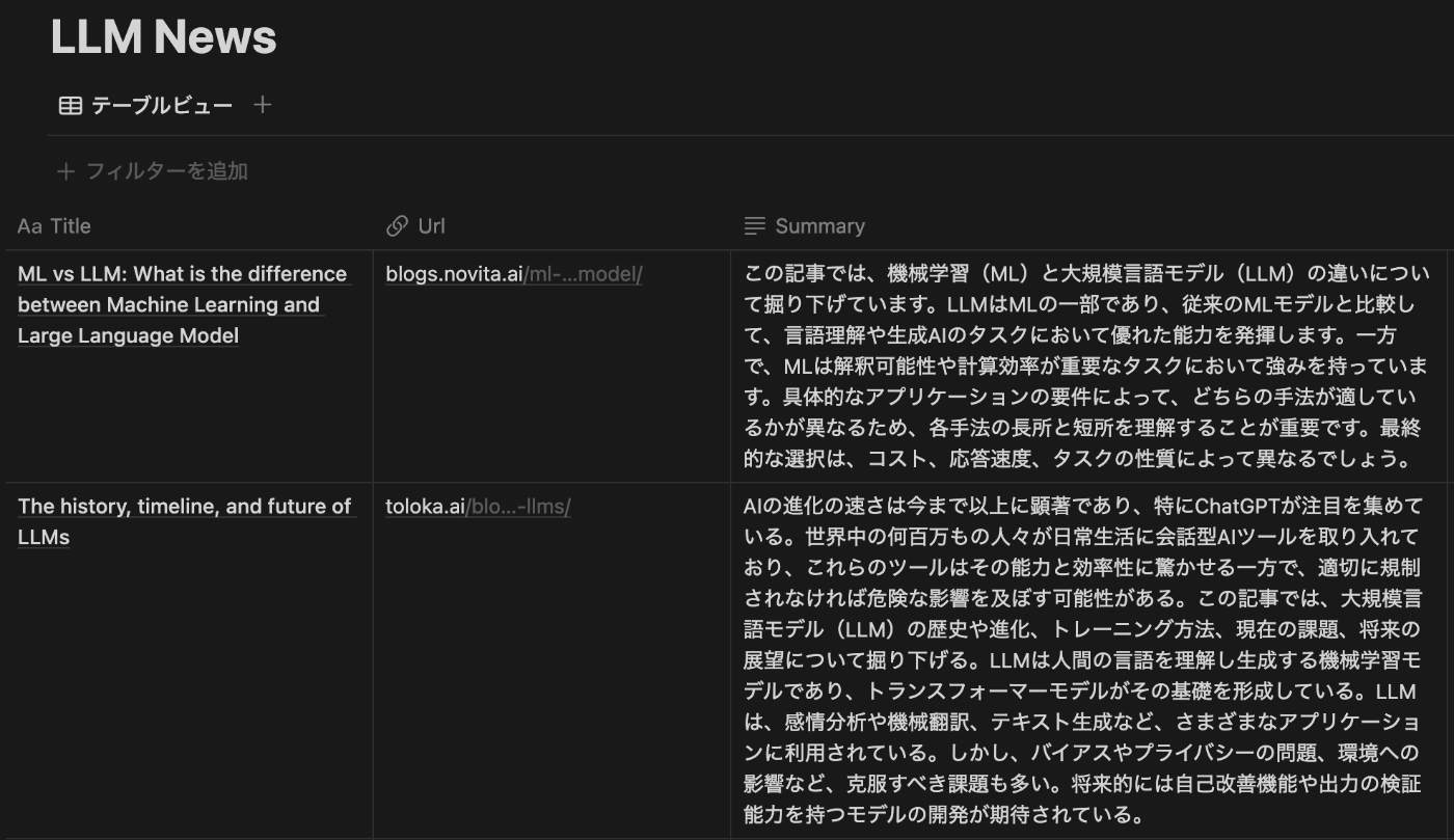 収集したいトピックとして「LLM」を指定してワークフローを実行すると、以下のようにNotion DBにページが追加されます。