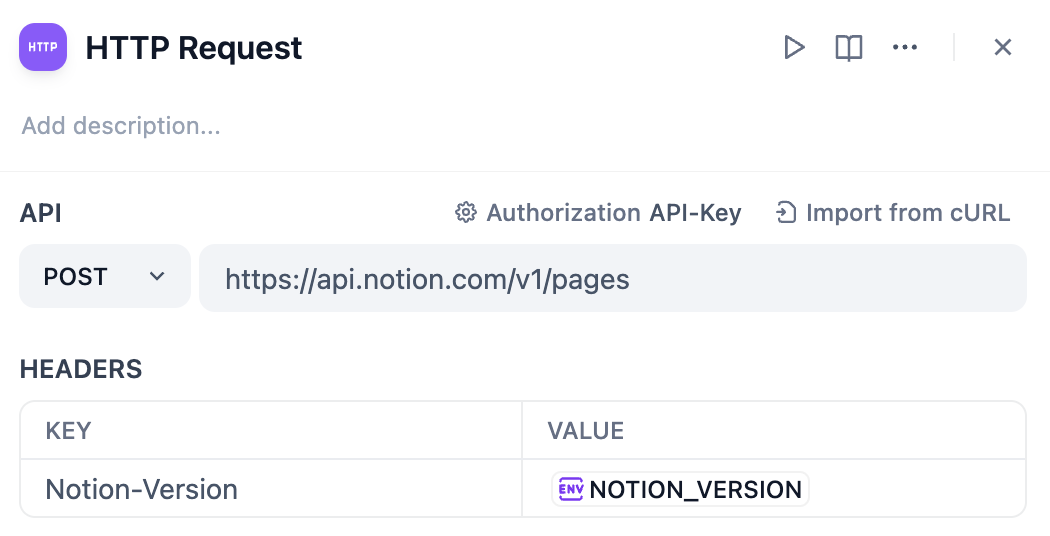 https://api.notion.com/v1/pages - Headers: 環境変数で設定した