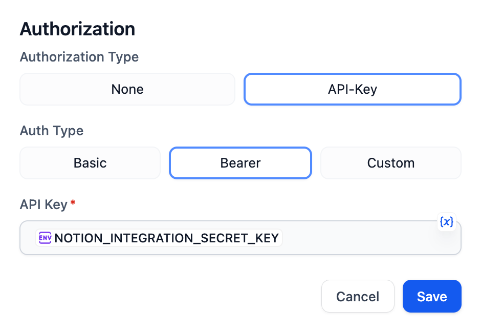 今回は以下のような設定にしており、API Keyとして環境変数で設定したNOTION_INTEGRATION_SECRET_KEYを指定しています。
