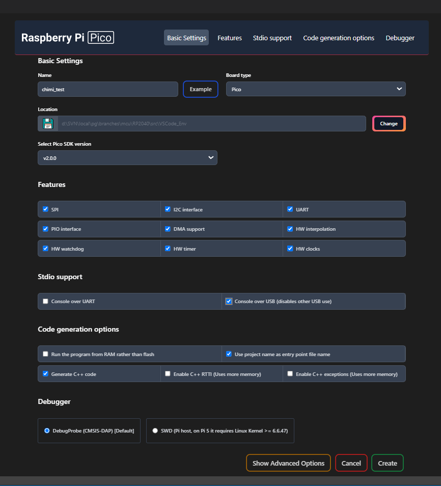 Code generation options...Generate C++ codeでPico SDKのコードを生成する -