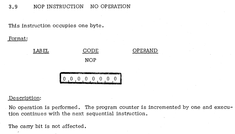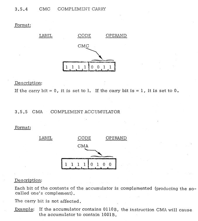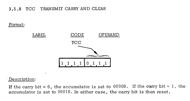 | 14 | ACCUMULATOR INSTRUCTIONS | TCC | Transfer carry to accumulator / キャリーをアキュムレータに転送 |